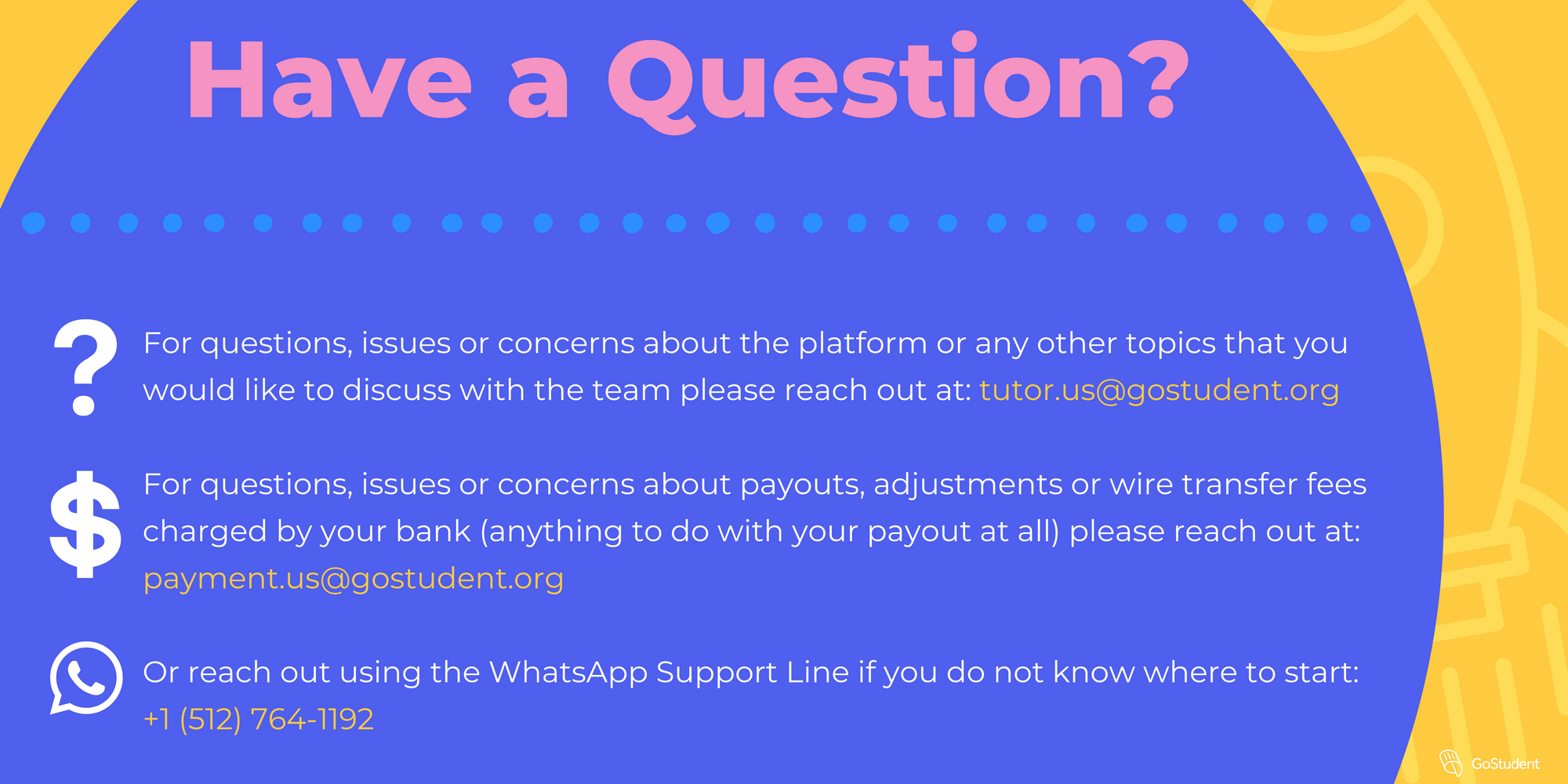 Tutor Team wanted to take a moment to speak on the topic of communication to help ensure that we are doing right by the tutors within our community and ensuring best practices. GoStudent, as a company, aims to provide full transparency and honesty throughout the tutor journey, and if ever you have questions, issues or concerns please reach out to the Tutor Team in the following ways: